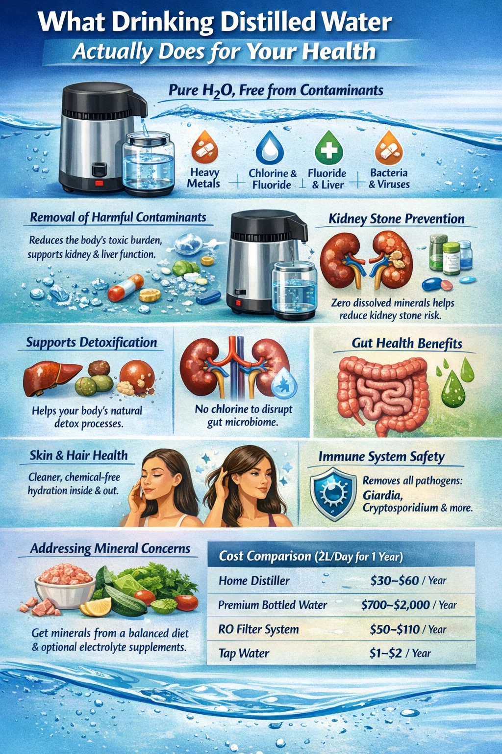 Distilled water is one of the purest forms of water available. It is produced by boiling water into steam and condensing it back into liquid, leaving behind dissolved solids, heavy metals, chlorine, fluoride, bacteria, and most other contaminants. The core health benefit is straightforward: you are consuming water with virtually zero chemical or biological load, which reduces your body's burden of processing unwanted substances every time you hydrate.