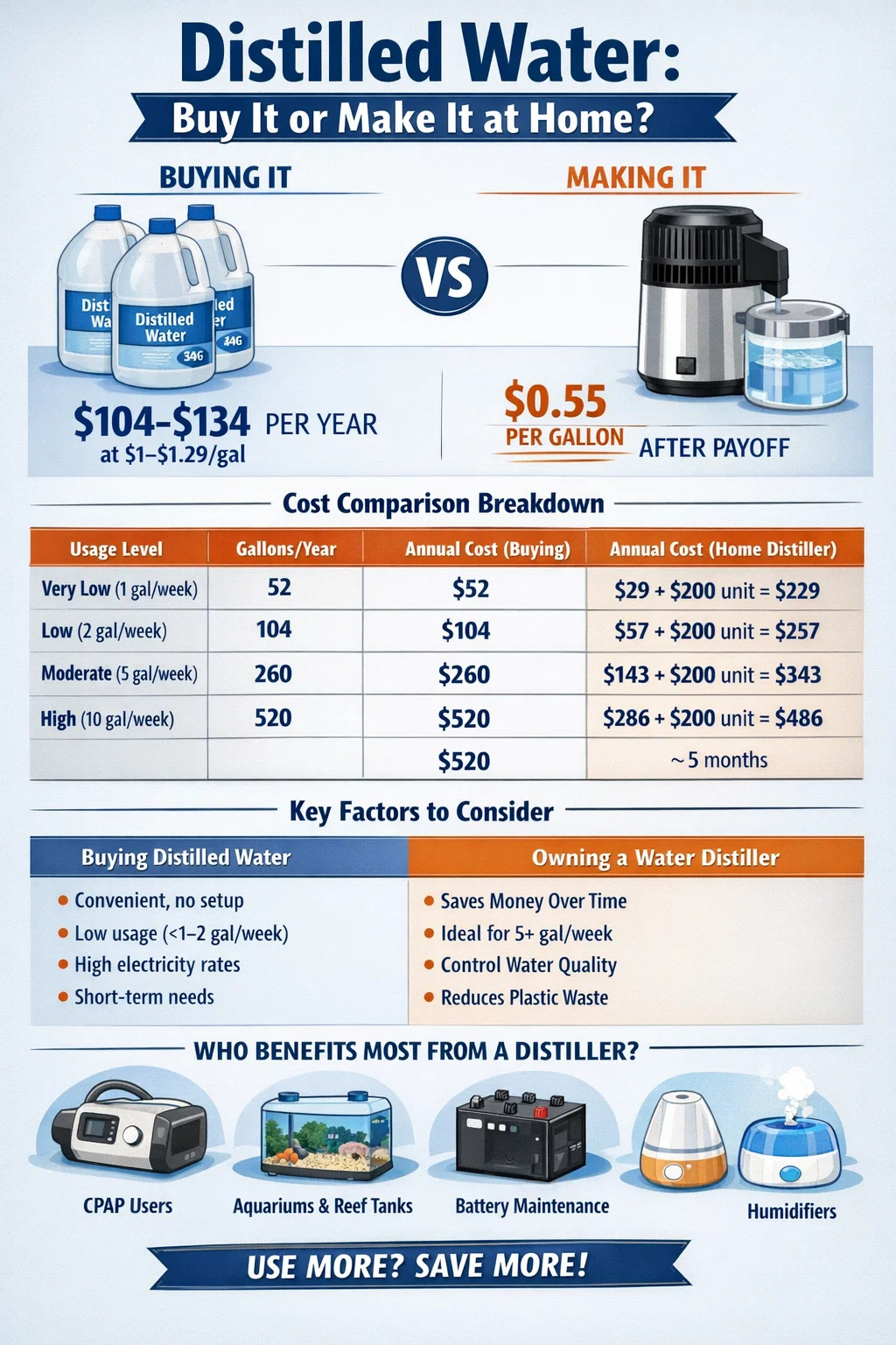 That said, the math isn't identical for everyone. If you only occasionally need a gallon for your iron or humidifier, buying it is perfectly reasonable. If you're running a CPAP machine every night, filling a large aquarium, or topping off a battery bank weekly, a home water distiller pays for itself fast and keeps saving you money for years.