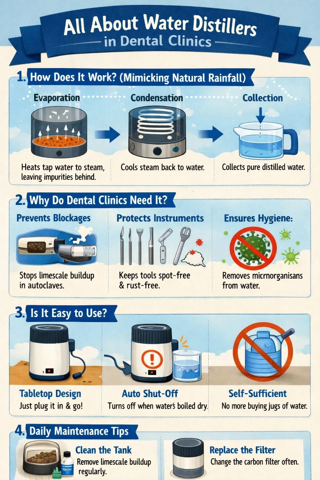 Protecting instruments: Water containing impurities may leave white spots or rust on dental instruments at high temperatures, shortening the lifespan of the instruments.
