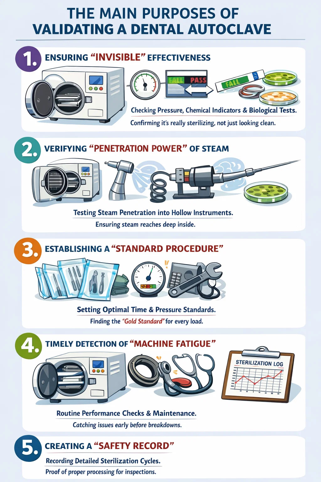 The role of validation: Through testing, it determines how long the machine needs to run and at what pressure to be most effective when loaded with a specific number of instruments. This provides a reproducible "gold standard" for daily operation.