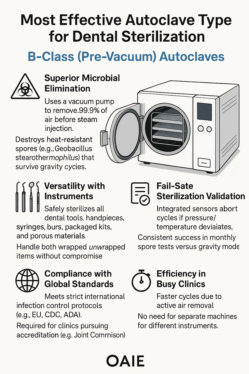 Safely sterilizes all dental tools: handpieces, syringes, burs, packaged kits, and porous materials.